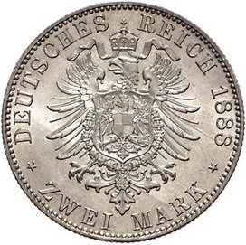 Los-Nummer: Auktion 51 - 2671 Münzen des Deutschen Kaiserreichs Sachsen Albert 1873-1902, 2 Mark 1888 E. Jaeger 121. Vorzüglich / Stempelglanz Schätzpreis: 500,- Zuschlag: unverkauft |