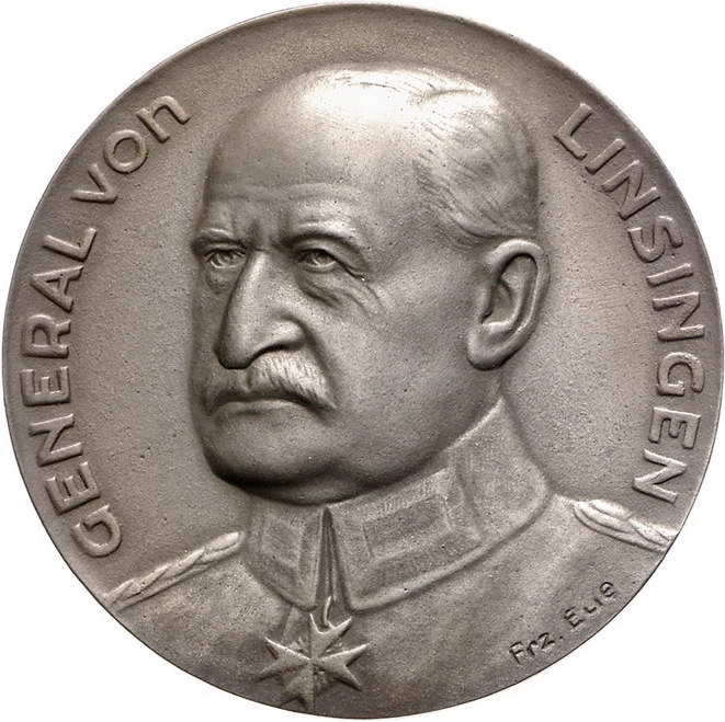 Los-Nummer: Auktion 51 - 2541 Medaillen Erster Weltkrieg Personenmedaillen Linsingen, Alexander von, Eisengussmedaille o.J. (1917), von Eue. Brustbild halblinks / Zwei sturmbereite Infanteristen. 92 mm. Vorzüglich Schätzpreis: 150,- Zuschlag: 120,- |