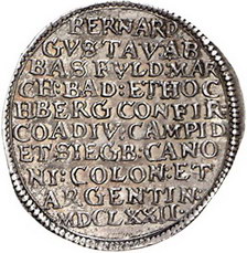 Los-Nummer: Auktion 51 - 828 Altdeutsche Münzen und Medaillen Fulda, Bistum Bernhard Gustav von Baden-Durlach 1671-1677, 1/8 Taler 1672. Vierfeldiges Wappen unter Kardinalshut vor Palme / Schrift. Gerling/Erdmann 75/1, Buchonia 4. 3,11 g. Vorzüglich Schätzpreis: 500,- Zuschlag: 460,- |