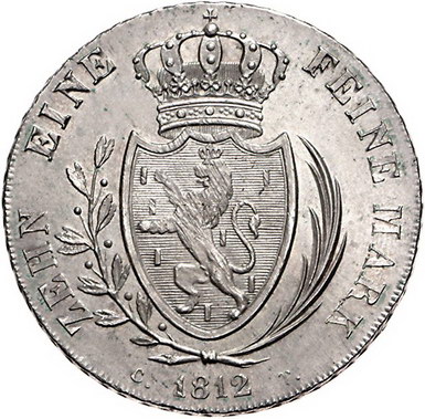 Los-Nummer: Auktion 51 - 1248 Altdeutsche Münzen und Medaillen Nassau Friedrich Wilhelm 1788-1816, Taler 1812. Jaeger 27, Thun 222, AKS 33, Kahnt 303. Laubrand. Vorzüglich - Stempelglanz Schätzpreis: 1000,- Zuschlag: 800,- |