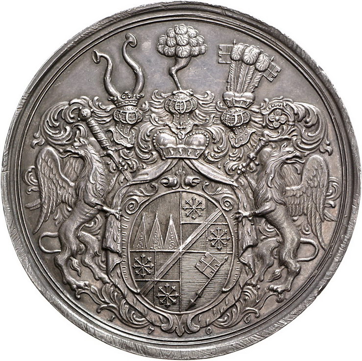 Los-Nummer: Auktion 51 - 1915 Altdeutsche Münzen und Medaillen Würzburg, Bistum Johann Philipp von Greifenklau 1699-1719, Medaillon#0Medaille# 1706, von Hautsch. Brustbild im Ornat nach rechts / Großer dreifach behelmter, von zwei Greifen gehaltener vierfeldiger Schild auf Mantel mit Fürstenhut. Helmschrott 494, Slg. Piloty 1075. 75,5 mm, 124,10 g. Schöne Patina. Leichte Randunebenheiten, vorzüglich Schätzpreis: 2500,- Zuschlag: 2850,- |