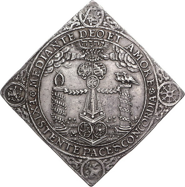 Los-Nummer: Auktion 51 - 1564 Altdeutsche Münzen und Medaillen Sachsen-Albertinische Linie Johann Georg II. 1656-1680, Talerklippe 1662. Auf das große Stahlschießen anlässlich der Vermählung seiner Tochter Erdmuthe Sophie mit Christian Ernst von Brandenburg-Bayreuth. Slg. Merseburger 1220, Schnee 914, Davenport 7631. #0var.Wappenstellung} Henkelspur, sehr schön Schätzpreis: 400,- Zuschlag: 560,- |
