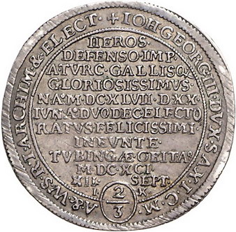 Los-Nummer: Auktion 51 - 1569 Altdeutsche Münzen und Medaillen Sachsen-Albertinische Linie Johann Georg III. 1680-1691, 2/3 Taler 1691. Auf seinen Tod. Arm aus Wolke mit Fahne / Schrift. Slg. Merseburger 1272, Kohl 309, Davenport 811. Schöne Patina. Minimal justiert, vorzüglich Schätzpreis: 250,- Zuschlag: 305,- |