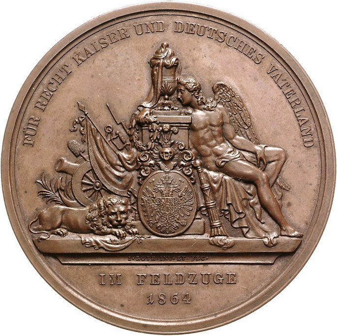 Los-Nummer: Auktion 51 - 1755 Altdeutsche Münzen und Medaillen Schleswig-Holstein, königliche Linie Der deutsch-dänische Krieg, Bronzemedaille 1864, von Roth. Zur Erinnerung an die österreichischen Gefallenen des deutsch-dänischen Kriegs. Trauernder Genius lehnt rechts an Postament mit Urne und behelmtem Wappenschild, links Löwe vor Kriegstrophäen / Sechs Zeilen Schrift in Eichenkranz. Wurzbach 6925 , Horsky 3783. 70 mm. Winz. Kratzer, vorzüglich + Schätzpreis: 150,- Zuschlag: 140,- |