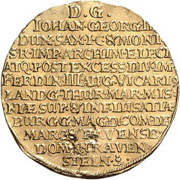 Los-Nummer: Auktion 51 - 1560 Altdeutsche Münzen und Medaillen Sachsen-Albertinische Linie Johann Georg II. 1656-1680, Fünffacher Dukat 1657. Auf das Vikariat. Kurfürst reitet im Kurornat mit geschultertem Schwert auf einem reich geschmückten Pferd nach rechts, zwischen den Läufen das sächsische Wappen / Zwölf Zeilen Schrift. Clauss/Kahnt 475, Slg. Merseburger -, Friedberg - vergl. 2718 , Baumgarten 424. 17,18 g. GOLD. Leichte Fassungsspuren, kl. Schrötlingsfehler, sehr schön - vorzüglich Schätzpreis: 5000,- Zuschlag: 5750,- |