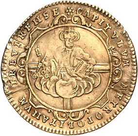 Los-Nummer: Auktion 51 - 1836 Altdeutsche Münzen und Medaillen Trier, Erzbistum Sedisvakanz 1715, Doppeldukat 1715. In einer runden verzierten Kartusche der Heilige Petrus / Gekrönte St. Helena mit dem Heiligen Rock. v. Schrötter 930, Friedberg - , vergl. Blätter für Münzfreunde 61, 1926 Seite 391 (Dort werden irrtümlich zwei Vierdukaten angegeben. Gemeint sind aber zwei Zweidukatenstücke, Vierdukatenstücke sind nicht bekannt). Das einzige von zwei geprägten Exemplaren im Handel. Fassungsspuren, sehr schön Schätzpreis: 7500,- Zuschlag: 12250,- |