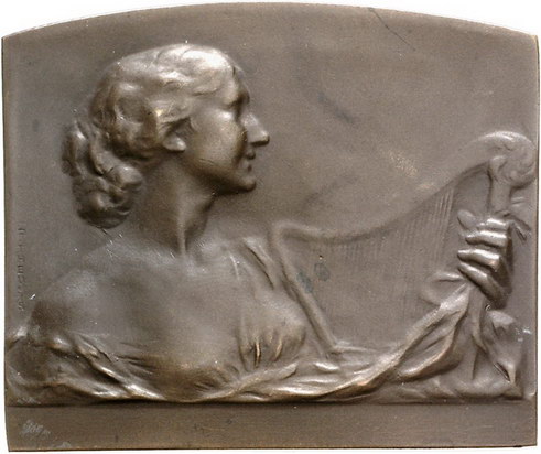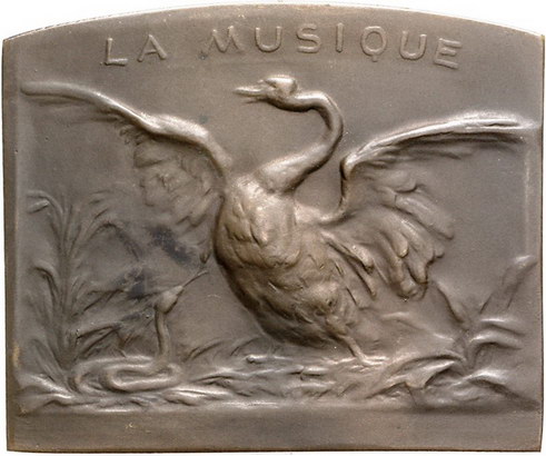 Los-Nummer: Auktion 51 - 2315 Medaillen Kunstmedaillen Theunis, Pierre Bronzeplakette#0Medaille# o.J. 'La Musique'. Aufgerichteter Schwan vor Schlange / Weibliche Person mit Harfe. 67 x 56,5 mm. Mattiert. Vorzüglich Schätzpreis: 90,- Zuschlag: unverkauft |