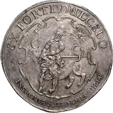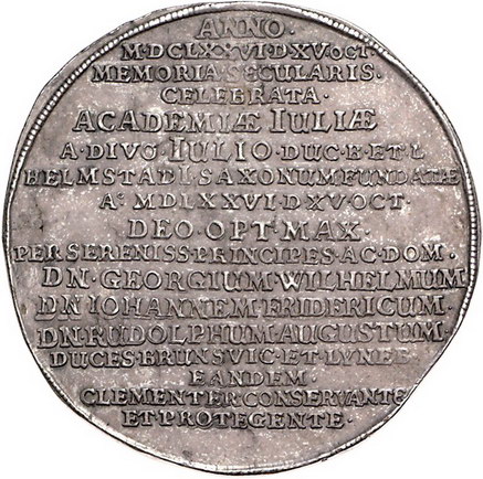 Los-Nummer: Auktion 51 - 662 Altdeutsche Münzen und Medaillen Braunschweig-Lüneburg-Celle Georg Wilhelm 1665-1705, Taler 1676. Auf die 100-Jahrfeier der Universität Helmstedt. Simson und der Löwe zwischen Mond und Sonne in einer verzierten Kartusche / Siebzehn Zeilen Schrift. Welter 1585, Davenport 6543. Schöne Patina. Vorzüglich Schätzpreis: 1500,- Zuschlag: 1550,- |