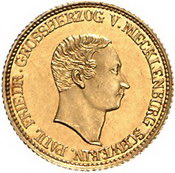 Los-Nummer: Auktion 51 - 1082 Altdeutsche Münzen und Medaillen Mecklenburg-Schwerin Paul Friedrich 1837-1842, 2 1/2 Taler 1840. Jaeger 81, AKS 31, Divo / Schramm 147 , Friedberg 1732. GOLD. Vorzüglich - Stempelglanz Schätzpreis: 1250,- Zuschlag: 1000,- |