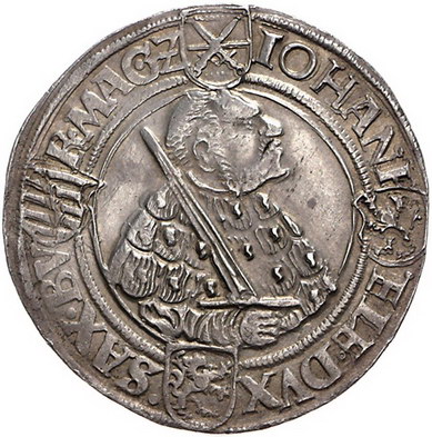 Los-Nummer: Auktion 51 - 1530 Altdeutsche Münzen und Medaillen Sachsen-Kurfürstentum Johann Friedrich und Moritz 1541-1547, Taler 1546, Annaberg. Keilitz 187, Slg. Merseburger -, Schnee 108, Davenport 9730, Schulten 3122 , Müseler 56.3.7, Slg. Vogelsang -. Vorzüglich Schätzpreis: 500,- Zuschlag: 675,- |
