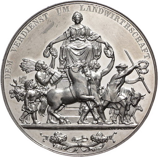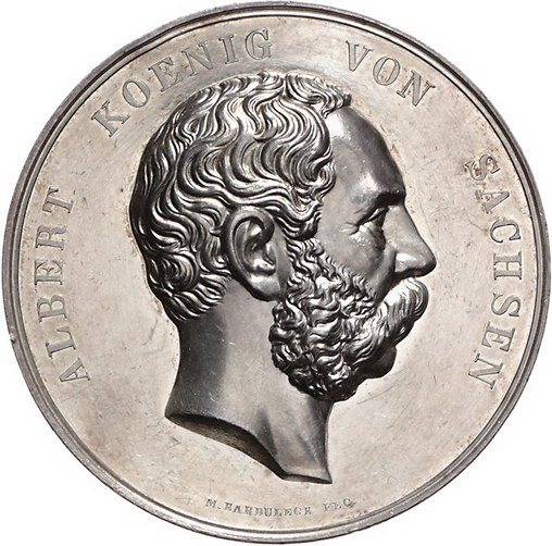 Los-Nummer: Auktion 51 - 1594 Altdeutsche Münzen und Medaillen Sachsen-Albertinische Linie Albert 1873-1902, Medaille o.J. (1874), von Barduleck und Krüger. Prämie des Ministeriums des Inneren für Verdienste um die Landwirtschaft. Kopf nach rechts / Thronende Saxonia bekränzt Bauern und Tiere. Barduleck vergl. 58. 51,5 mm, 74,98 g. Kl. Randfehler, Kratzer, vorzüglich Schätzpreis: 175,- Zuschlag: 250,- |