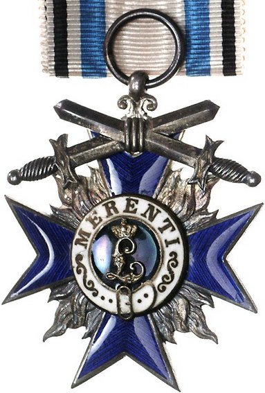 Los-Nummer: Auktion 51 - 146 Altdeutsche Münzen und Medaillen Bayern Prinzregent Luitpold 1886-1913, Militär Verdienstorden#0Medaille#. 4. Klasse mit Schwertern, Silber. Blau emailliertes Kreuz, in den Winkeln Flammen. Löwe nach links auf schwarzem Grund / Gekröntes Monogramm auf schwarzem Grund. Gestiftet 1866, verliehen 1905-1918. Nimmergut 482, OEK 410, Klenau 327. 49 x 41 mm. Weißes Band mit blau-schwarzen Streifen. Originaletui. Vorzüglich Schätzpreis: 300,- Zuschlag: 290,- |