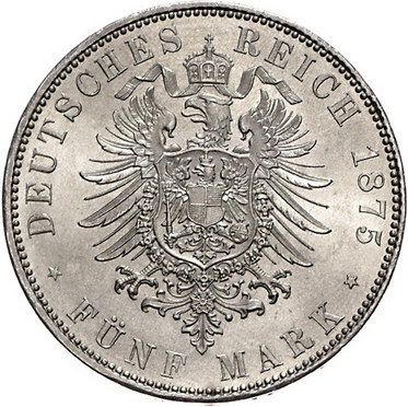 Los-Nummer: Auktion 51 - 2672 Münzen des Deutschen Kaiserreichs Sachsen Albert 1873-1902, 5 Mark 1875 E. Jaeger 122. Kl. Schrötlingsfehler auf der Vorderseite, fast Stempelglanz Schätzpreis: 1250,- Zuschlag: unverkauft |
