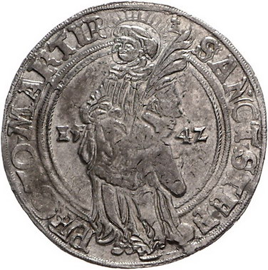Los-Nummer: Auktion 51 - 853 Altdeutsche Münzen und Medaillen Halberstadt, Bistum Albrecht von Brandenburg 1513-1545, Taler 1542. Stehender St. Stephan mit Palmzweig nach links gewandt / Vierfeldiges Wappen mit aufgelegten kleinen Wappen unter Kardinalshut. Besser/Brämer/Bürger 40.17, Davenport 9210, Zepernick 296, Schulten 1035. Winz. Randfehler, vorzüglich + Schätzpreis: 600,- Zuschlag: 550,- |