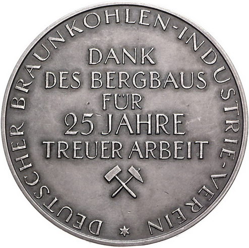 Los-Nummer: Auktion 51 - 1610 Altdeutsche Münzen und Medaillen Sachsen-Dresden, Stadt Medaillen von Friedrich Wilhelm Hörnlein, Medaille o.J. (1926) des Deutschen Braunkohlen-Industrie-Vereins für 25 Jahre treue Arbeit. Bergmann mit Lehrling deutet auf Braunkohlentagebau, im Hintergrund Elektrizitätswerk / Schrift über Eisen und Schlägel. Arnold 200, Müseler 15.3.13. 50,5 mm, 38,3 g. Mattiert. Vorzüglich Schätzpreis: 75,- Zuschlag: 80,- |