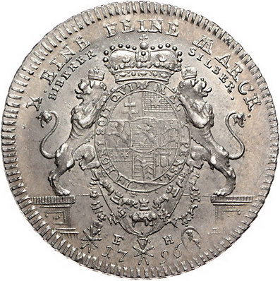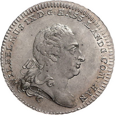 Los-Nummer: Auktion 51 - 917 Altdeutsche Münzen und Medaillen Hessen-Kassel Wilhelm IX. 1785-1803, Taler 1796. Bieberer Ausbeute. Büste mit im Nacken zusammengebundenen Haaren nach rechts / Von zwei Löwen gehaltenes, gekröntes und mit Ordenskette behangenes Wappen. Schütz 2150, Hoffmeister 2700, Davenport 2305, Müseler 28.1/23 a. Vorzüglich - Stempelglanz Schätzpreis: 600,- Zuschlag: 575,- |