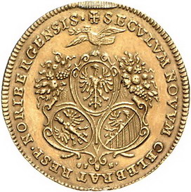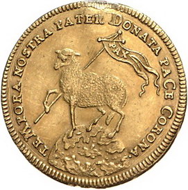 Los-Nummer: Auktion 51 - 1273 Altdeutsche Münzen und Medaillen Nürnberg, Stadt Doppelter Lammdukat 1700. Jahreszahl als Chronogramm. Kellner 51, Friedberg 1882. GOLD. Henkelspur, sehr schön Schätzpreis: 200,- Zuschlag: 265,- |