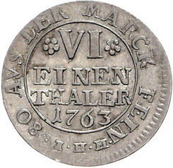 Los-Nummer: Auktion 51 - 1308 Altdeutsche Münzen und Medaillen Oldenburg Friedrich V. von Dänemark 1746-1766, 1/6 Taler 1763 IHM/N, Oldenburg. Münzmeister Johann Heinrich Madelung. Stempelschneider Samuel Matthias Neudorf. Großer Kopf des Königs nach rechts / Wert und Jahreszahl in vier Zeilen. Kalvelage/Trippler 334, Jaeger 18 b, Hede 4 C. Sehr schön Schätzpreis: 300,- Zuschlag: 320,- |