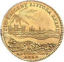 Los-Nummer: Auktion 51 - 1368 Altdeutsche Münzen und Medaillen Pfalz-Kurlinie Karl Theodor 1742-1799, Rheingolddukat 1764, Mannheim. Drapiertes Brustbild mit im Nacken zusammen gebundenen Haaren nach rechts, darunter Stempelschneiderinitialen AS des Anton Schäffer / Seitenverkehrte Ansicht Mannheims vom Rhein her, am gegenüber liegendem Ufer Goldwäscher, links ein Bäumchen. Slg. Noss 369, Slg. Memmesheimer 2488, Friedberg 2037, Haas 63 a. #063, 63 a} GOLD. Minimal gewellt, fast Stempelglanz Schätzpreis: 2000,- Zuschlag: 1600,- |