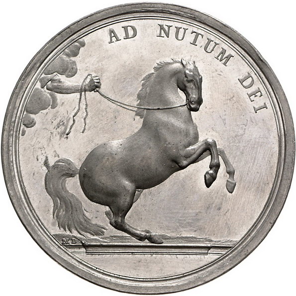 Los-Nummer: Auktion 51 - 648 Altdeutsche Münzen und Medaillen Braunschweig-Wolfenbüttel Elisabeth Christine *1691, +1750, Zinnmedaille o.J., von Matthias Donner. Brustbild nach rechts / Hand aus Wolke führt ein sich nach rechts aufbäumendes Pferd. Brockmann 436 a, Slg. Montenuovo -. 61 mm. Prachtexemplar. Stempelglanz Schätzpreis: 225,- Zuschlag: 300,- |