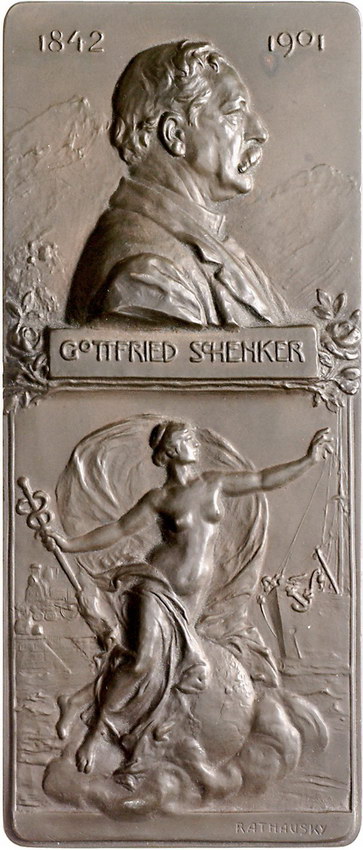 Los-Nummer: Auktion 51 - 2459 Medaillen Personenmedaillen Schenker, Gottfried *1842 Däniken/Schweiz, +1901 Wien, Einseitige Bronzegussplakette 1901, von Rathausky. Auf seinen Tod. Brustbild nach rechts, darunter unbekleidete Frau neben von Wolken umgebenem Globus. 141 x 61 mm. Vorzüglich Schätzpreis: 250,- Zuschlag: unverkauft |
