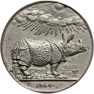 Los-Nummer: Auktion 51 - 1284 Altdeutsche Münzen und Medaillen Nürnberg, Stadt Medaillen, Silbergussmedaille 1748, von P.P. Werner. Auf das gezeigte Nashorn. Nashorn in Palmlandschaft unter strahlender Sonne / Vierzehn Zeilen französischer Text über Maß und Futtermengen des Nashorns. Slg. Erlanger 1138 , Imhoff II 189.60. 38,5 mm, 15,41 g. Älterer Guss. Sehr schön - vorzüglich Schätzpreis: 200,- Zuschlag: 540,- |