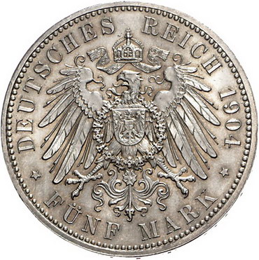 Los-Nummer: Auktion 51 - 2686 Münzen des Deutschen Kaiserreichs Sachsen Georg 1902-1904, 5 Mark 1904 E. Auf seinen Tod. Jaeger 133. Vorzüglich - Stempelglanz Schätzpreis: 150,- Zuschlag: unverkauft |