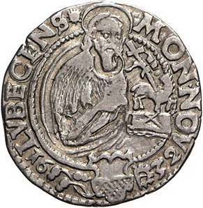 Los-Nummer: Auktion 51 - 1009 Altdeutsche Münzen und Medaillen Lübeck, Stadt 1/4 Taler 1632. Behrens 270 a. Kl. Randfehler, sehr schön + Schätzpreis: 500,- Zuschlag: unverkauft |