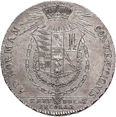 Los-Nummer: Auktion 51 - 1892 Altdeutsche Münzen und Medaillen Württemberg Friedrich Eugen 1795-1797, Taler 1795. Auf das 300jährige Bestehen des Herzogtums. Brustbild nach links / Unter strahlender Krone das mit Ordenskette behangene Wappen. Klein/Raff 460, Davenport 2873. Vorzüglich - Stempelglanz Schätzpreis: 1500,- Zuschlag: 1200,- |