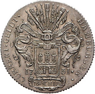 Los-Nummer: Auktion 51 - 873 Altdeutsche Münzen und Medaillen Hamburg-Stadt 16 Schilling 1731 IHL. Gaedechens 693, Jaeger 12. Prachtexemplar. Erstabschlag. Fast Stempelglanz Schätzpreis: 250,- Zuschlag: 340,- |
