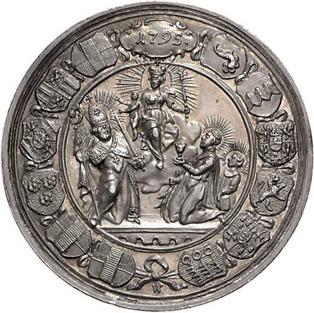 Los-Nummer: Auktion 51 - 1930 Altdeutsche Münzen und Medaillen Würzburg, Bistum Sedisvakanz 1795, Medaille 1795, von Werner. Madonna über drei Heiligen / Drei Wappen umgeben von zehn weitere Wappen. Helmschrott 943, Zepernick 263. 45,5 mm, 29,19 g. Schöne Patina. Vorzüglich - Stempelglanz Schätzpreis: 600,- Zuschlag: 675,- |