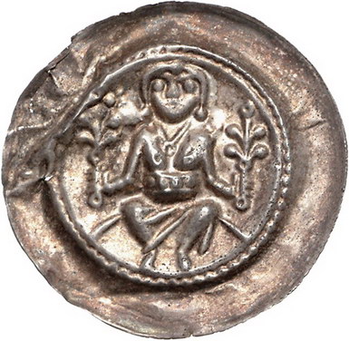 Los-Nummer: Auktion 51 - 1502 Altdeutsche Münzen und Medaillen Sachsen-Meißen, markgräflich wettinische Mzst. Dietrich der Bedrängte 1197-1221, Brakteat. 1,07 g. Auf Bogen sitzender Markgraf hält in jeder Hand ein Blumenzepter, wobei das linke Zepter mit einem Kugelkreuz bestückt ist. Schwinkowski 443, Slg. Krug 31. Gedrückt, sehr schön Schätzpreis: 100,- Zuschlag: 160,- |