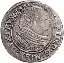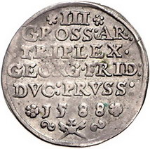 Los-Nummer: Auktion 51 - 1428 Altdeutsche Münzen und Medaillen Preußen, Herzogtum (Ostpreußen) Georg Friedrich als Administrator 1578-1603, Dreigröscher 1588, Königsberg. Neumann 57, v. Schrötter 1279 ff. Sehr schön Schätzpreis: 300,- Zuschlag: 365,- |