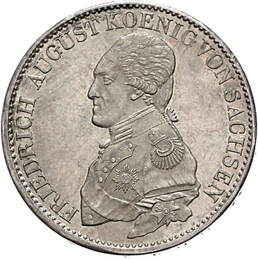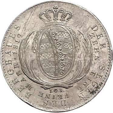 Los-Nummer: Auktion 51 - 1583 Altdeutsche Münzen und Medaillen Sachsen-Albertinische Linie Friedrich August I. 1806-1827, Ausbeutetaler 1819 IGS. Jaeger 31, Thun 299, AKS 23, Kahnt 423. Vorzüglich - Stempelglanz Schätzpreis: 400,- Zuschlag: 480,- |