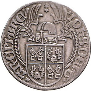 Los-Nummer: Auktion 51 - 681 Altdeutsche Münzen und Medaillen Bremen, Erzbistum Johann III. von Rode 1497-1511, 1/3 Taler o.J., Bremen. Behelmter vierfeldiger Wappenschild / Auf einer Mondsichel Madonna mit Kind in Flammenglorie, unten das Bremer Stadtwappen. Jungk 107 , Slg. Danziger 80. Von größter Seltenheit. Schöne Patina. Sehr schön - vorzüglich Schätzpreis: 2500,- Zuschlag: 4600,- |