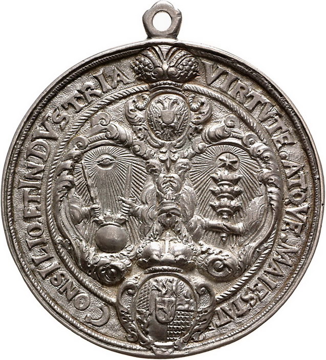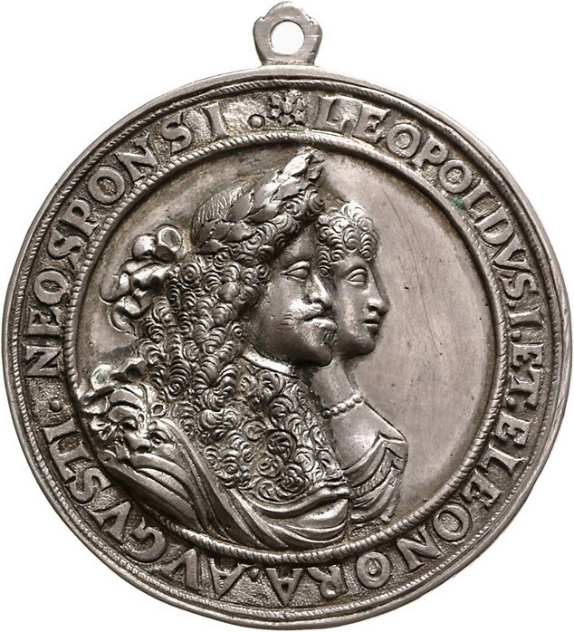 Los-Nummer: Auktion 51 - 2089 Haus Habsburg Haus Habsburg Leopold I. 1657-1705, Gussmedaille 1676. Auf seine Vermählung mit Eleonora von der Pfalz. Gestaffelte Brustbilder nach rechts / Die gekrönten Wappen von Habsburg und der Pfalz, dazwischen Allegorien. Slg. Montenuovo 889 , Slg. Wolff 662, Slg. Julius 114, Stemper 297, Exter I 270,255, Domanig 401. 66 mm, 65,17 g. Originalhenkel. Felder bearbeitet, vorzüglich Schätzpreis: 300,- Zuschlag: 310,- |