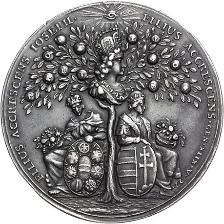 Los-Nummer: Auktion 51 - 2138 Haus Habsburg Haus Habsburg Josef I. 1705-1711, Medaille 1690, von P.H. Müller. Auf seine Krönung in Augsburg. Brustbilder des Kaiserpaares umgeben von sieben Medaillonbildern der Kurfürsten / Granatbaum mit dem Brustbild des jungen Königs, darunter hält sitzende Germania Schild mit den Wappen der Kurfürsten, daneben Ungaria mit ungarischem Schild. Slg. Montenuovo 1210 , Slg. Julius 532, Forster 828. 48 mm, 30,82 g. Dunkel patiniert, kl. Randfehler, fast vorzüglich Schätzpreis: 400,- Zuschlag: 500,- |