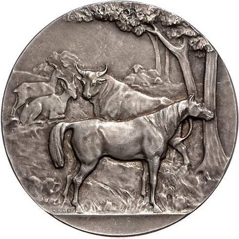 Los-Nummer: Auktion 51 - 844 Altdeutsche Münzen und Medaillen Hagen, Stadt Prämienmedaille 1905 der landwirtschaftlichen Ausstellung für Obstbau. Pferd steht nach rechts, im Hintergrund Schafe, Ziegen und eine Kuh neben Bäumen / Verzierte Schrifttafel. 50 mm, 45,13 g. Mattiert. Vorzüglich Schätzpreis: 75,- Zuschlag: 120,- |
