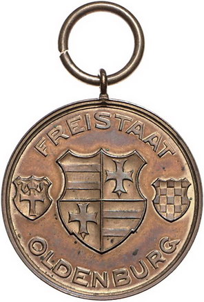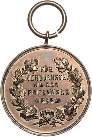 Los-Nummer: Auktion 51 - 1331 Altdeutsche Münzen und Medaillen Oldenburg Freistaat, Tragbare Bronzemedaille o.J. Für Verdienste um das Feuerlöschwesen. Wappen / Schrift in Eichenzweigen. Nimmergut 1577. 30 mm. Originalöse. Winz. Korrosionsspuren, vorzüglich Schätzpreis: 150,- Zuschlag: 200,- |